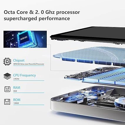 • “【8GB RAM+ 128GB ROM and Max 1TB TF-card Support】You are able to storage more movies and photos with 128GB and the tablet supports up to 1TB expandable storage ( MicroSD card not included in the product ). With plenty of space for books, music, photos, games, and more, you can indulge without worrying about storage capacity.