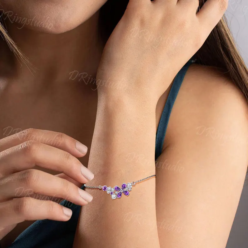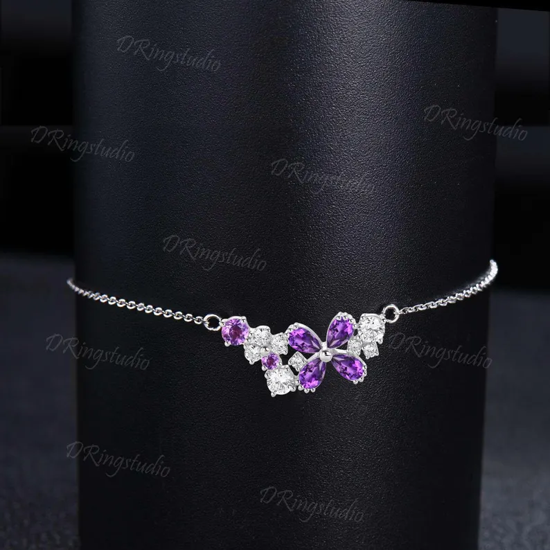 14k White Gold Natural Amethyst Bracelet Cluster Genuine Diamond Bracelet Dainty Layering Bracelet Floral Wedding Bracelet Anniversary Gift
