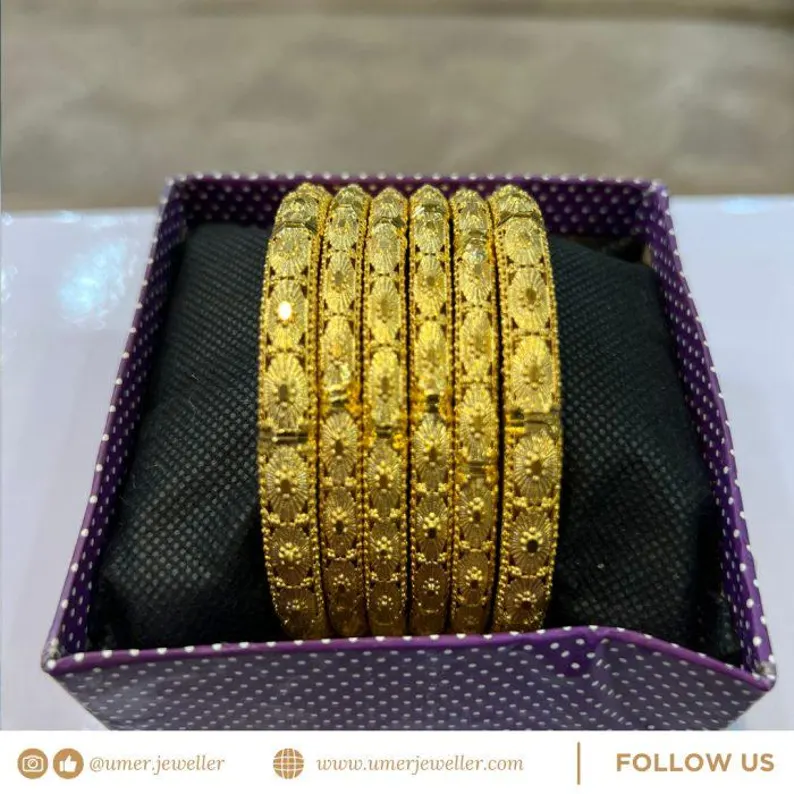 Add ‘Chaar Chand’ to your birdal look, wedding events (Mehndi, Nikkah, Barat, Walima), or festive outfits with these stunning gold plated bangles. Designed to match real gold jewelry, they give you luxury shine for less—perfect for Indian, Pakistani, and Asian brides! You can also wear these amazing gold plated bangles for parties and special functions.