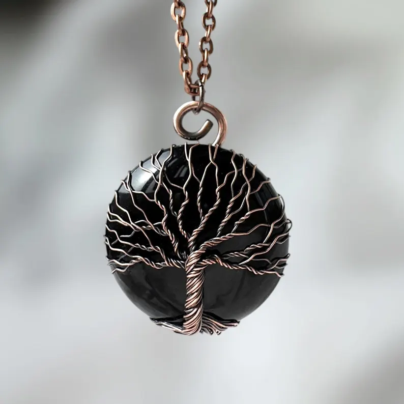 10th Anniversary Black Onyx and Copper Wire Wrapped Tree Of Life Pendant for Him, Tin Alternative Jewelry, 10 Years Together Necklace