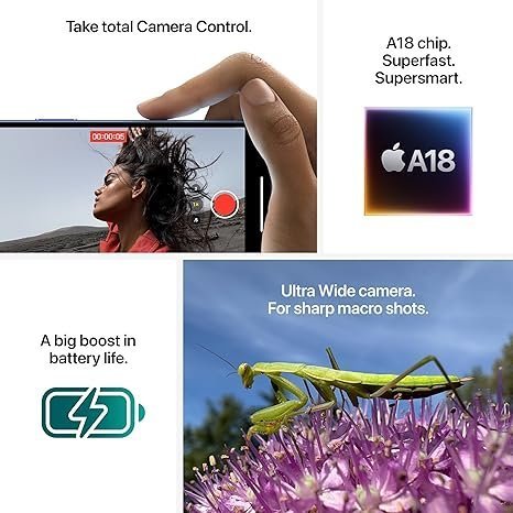 • SUPERSMART A18 CHIP—A18 jumps two generations ahead of the A16 Bionic chip in iPhone 15. It enables advanced photo and video features, and supports console-level gaming, with exceptional power efficiency.