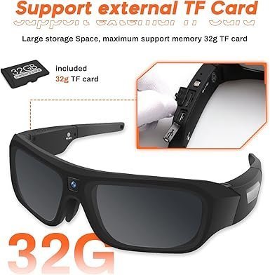 - Check Your Video: This Camera Glasses supports up to a 256GB memory card (NOT INCLUDED), included 32GB sd card.You can playback the content on a computer or a tv by the included usb cable