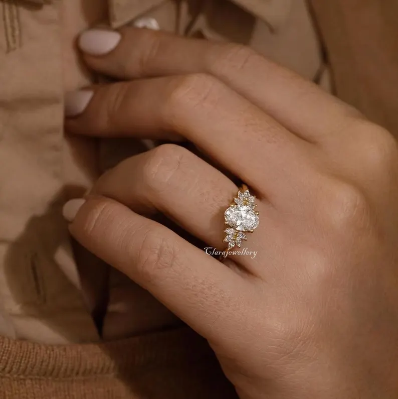 2 CT Oval Cluster Moissanite Engagement Ring, Vintage Oval Diamond Wedding Ring, 14K Solid White Gold Ring, Floral Style Proposal Ring.