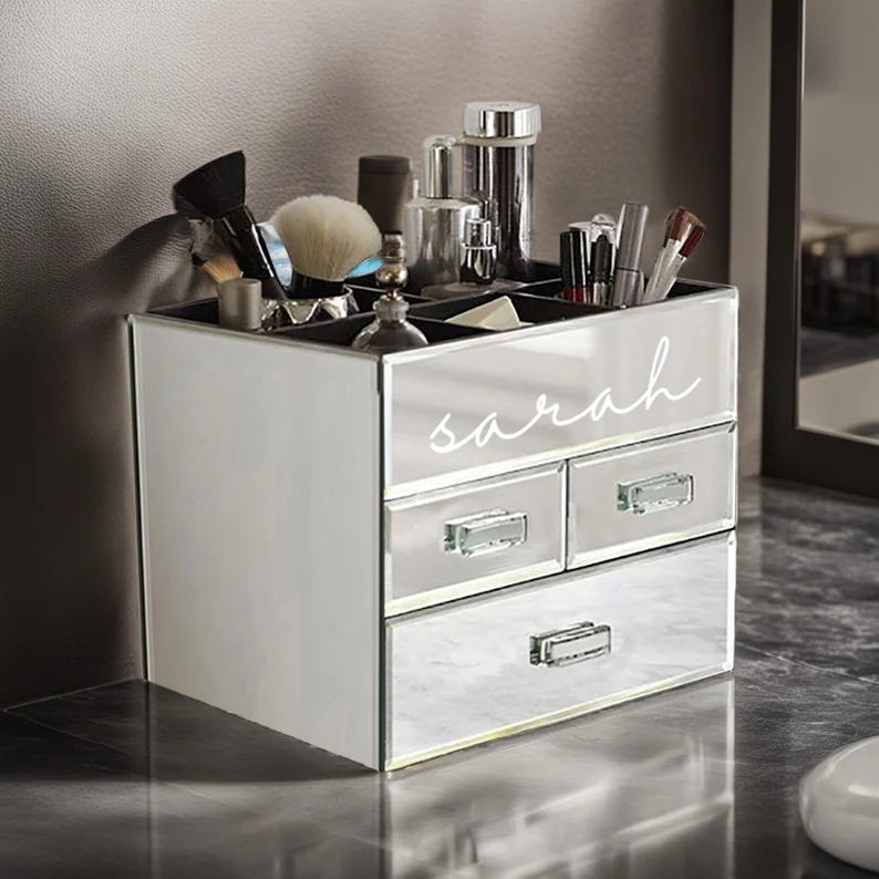 Personalized Handmade Mirror Cosmetic Organizer – 3 Drawer Mirrored Bathroom Vanity Desktop Jewelry Makeup Storage Bin – Rose Gold or Silver