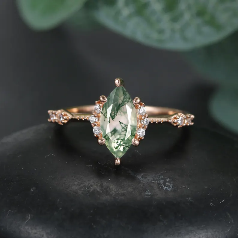 Unique Marquise cut moss agate Engagement Ring vintage S925 Silver Wedding Ring Green Agate Gemstone Ring, Anniversary Gift for Her
