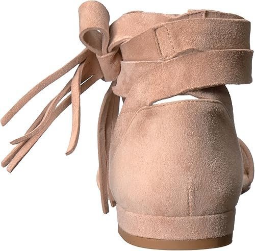 • Suede sandal with ankle-wrap tie closure featuring fringe ends